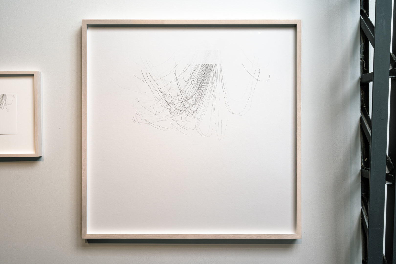 Lors de la présentation de l’installation Autofading_Se disparaître à la Galerie des arts visuels en 2021, j’ai invité Nancy Tobin pour élaborer une partition en mouvements avec le casque de réalité virtuelle. Cette collaboration a donné lieu à un dessin donnant à voir le câble reliant l’ordinateur au casque durant les déplacements de la performeuse en train d'explorer l'œuvre.Clairières, graphite sur papier